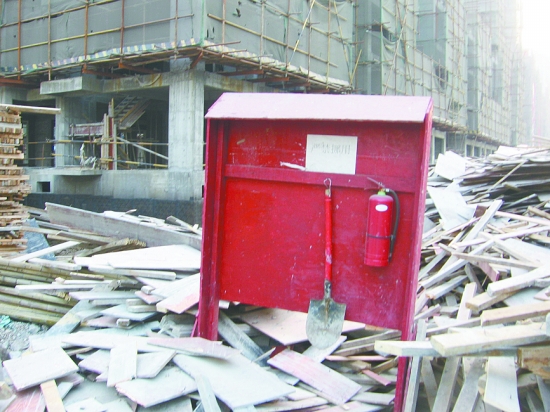 按照這位施工人員的提醒,記者看到,在“文明施工”警示牌西南側4米,有一個木質報刊亭狀的消防設備存放點,偌大的存放點僅放著一把消防鐵鍬和一個干粉滅火器,而該消防設備存放點的四周卻橫七豎八堆放著木料、鋼管等物。