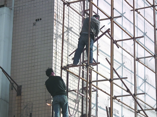 昨日下午,在大楊樹商業街同一首歌KTV裝修工地現場,2名施工人員在沒有任何防護設施的情況下,站在離地面約5米高的鋼管架上,拿著電焊切割原來的廣告架,產生的火花直接落在了地面上零落的木版、紙屑上……