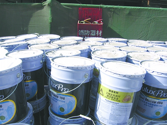 據了解,這一情況在市區其他在建工地也很多見。如建業森林半島三期工程建筑工地的一個消防設備存放點,就被桶裝的墻壁涂料擋在了里面。