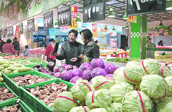 圖為昨日,市民在溫縣盛弘超市選購直銷蔬菜。溫縣一些大型超市采取“農超對接”供銷方式,直接從農民專業合作社、蔬菜種植大戶手中采購時鮮蔬菜,降低采購成本。