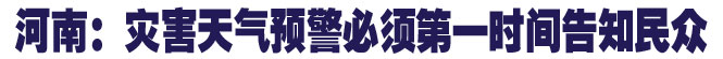 河南省規定,氣象災害預警級別分為特別重大、重大、較大、一般四級,分別用紅、橙、黃、藍四種顏色標示。如遇特別重大的一級預警,由省政府分管副省長簽發紅色標志的一級預警信息。