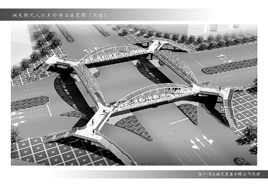 以人民路與塔南路交叉口的天橋為例,該橋設(shè)計方案平面為主體口字形,四個方向8個步梯。人行天橋人行部分寬4米,和每條道路的人行道寬度5米基本一致,完全可以保證行人通行。如果市政和交通上需要,可把每個拐角的一個步梯延伸成坡狀,同時解決非機動車跨越道路的問題。在立面造型上,擬建方案打破了通常人行天橋的平直造型,突出主體的大弧形造型,與背景高層建筑的方正外形形成了生動對比。在夜間,天橋上美麗的燈光造型必將使其成為我市的景觀焦點,為我市增光添彩。