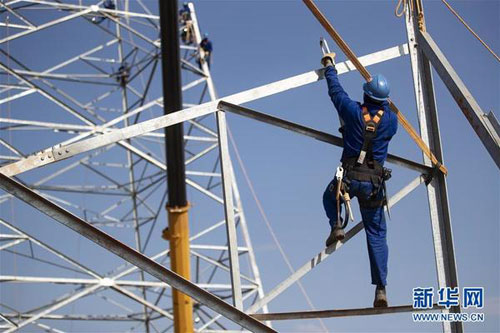 2018年8月7日,在巴西東南部米納斯吉拉斯州阿科斯市附近,工人在巴西美麗山特高壓輸電工程二期第九標段項目現場施工。新華社記者李明攝
