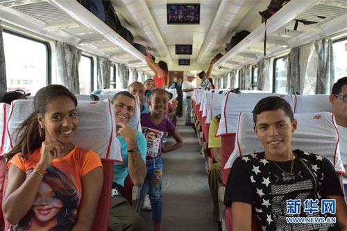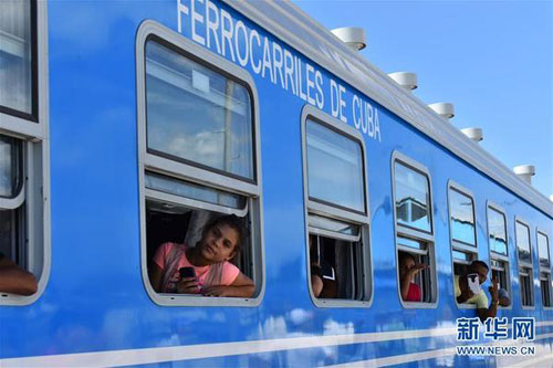 2019年7月13日,在古巴首都哈瓦那,乘客們坐在一列由中國設計并生產的鐵路客車組成的列車上。新華社記者 朱婉君 攝