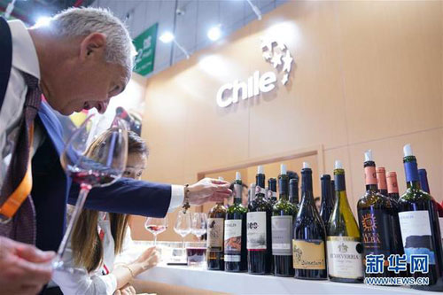 2018年11月5日,在中國上海,一名男子在首屆中國國際進口博覽會上了解智利紅酒。新華社記者孟鼎博攝