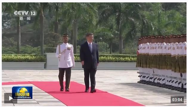 習近平乘車抵達時,易卜拉欣和馬來西亞總理安瓦爾在下車處熱情迎接。兩國元首登上檢閱臺,軍樂團奏中馬兩國國歌,鳴禮炮21響。習近平檢閱儀仗隊。兩國元首進入國家王宮大廳,同雙方陪同人員握手致意。