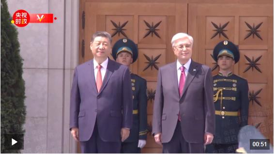 習近平抵達阿斯塔納納扎爾巴耶夫國際機場時,托卡耶夫總統(tǒng)率總統(tǒng)辦公廳主任達杰拜、副總理兼外長努爾特列烏、總統(tǒng)外事顧問卡濟漢、阿斯塔納市長卡瑟姆別克等高級官員熱情迎接。身著盛裝的哈薩克斯坦女青年向習近平獻花。禮兵分列藍地毯兩側(cè)致敬,哈薩克斯坦少年兒童手持中哈兩國國旗熱烈歡迎習近平到訪。習近平在托卡耶夫陪同下觀看儀仗隊分列式,直升機懸掛中哈國旗從機場上空飛過。在機場貴賓樓內(nèi),兩國元首還共同欣賞哈薩克斯坦少年兒童的文藝表演。
