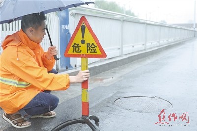 由于雨水排量大,井蓋被水壓沖擊不停翹起,焦作騰飛市政公司員工及時(shí)安放警示牌。