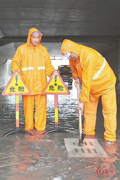 市政人員撬開(kāi)地下出水口,加速積水排出。