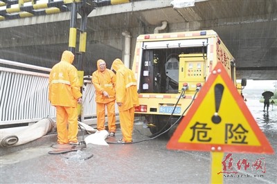 7月21日上午,山陽(yáng)路新月鐵路橋下積水嚴(yán)重,焦作騰飛市政公司員工用抽水設(shè)備加急排水。