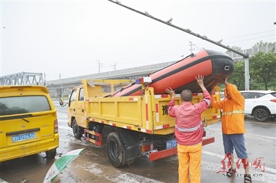 市政人員在易形成積水的人民路怡光路店后立交橋下安放沖鋒舟。