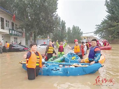 7月24日,該救援隊伍又轉戰衛輝市占城鎮轉移被困村民。這次救援,隊員成功轉移100多名群眾。