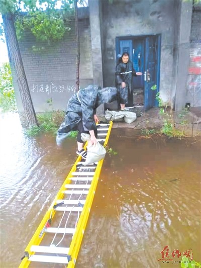 焦作移動搶險突擊隊員架云梯運沙袋保基站。蘇利明 攝