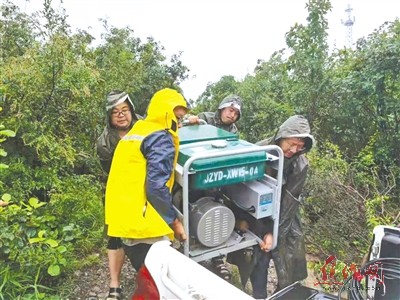 焦作移動搶險突擊隊員在暴雨中抬發電機上山發電。 武 曉 攝