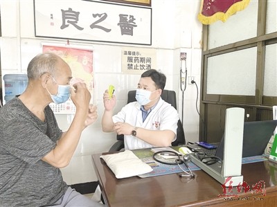 王永衛(wèi)(右)正在給慕名而來(lái)的病人做檢查。