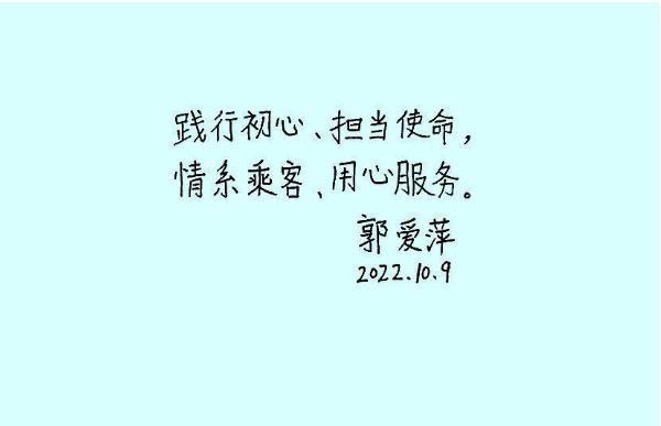 行萬里路,載千萬客。郭愛萍用她的一言一行,讓乘客獲得快樂,用她的一舉一動,讓線路成為風(fēng)景。她以樸實無華的行動在平凡的崗位上詮釋著人生的真諦,用一顆真誠的心感染著身邊的人。我們每一個人都應(yīng)該致敬楷模、學(xué)習(xí)楷模,在平凡的崗位取得不平凡的成績。