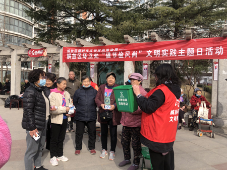 倡導節儉風尚,普及垃圾分類知識。3月3日,解放區環衛處、解放區分類辦組織志愿者在西城美苑小區開展“倡節儉風尚”文明實踐主題日宣傳活動,向居民宣傳生活垃圾分類知識,吸引了許多過往居民駐足參與;顒蝇F場,志愿者精心安排了垃圾分類大轉盤、貼貼樂等互動游戲,居民只要答對有關垃圾分類知識的問題,或將印有不同垃圾的貼紙貼在相對應的紙板上,就能獲得小禮品。參與活動的既有耄耋老人,也有學前兒童,時而有人答對問題歡呼雀躍,時而有人認真看宣傳展板學習垃圾分類知識,整個活動高潮迭起。同時,志愿者們還不忘向居民分發垃圾分類宣傳頁,宣傳垃圾分類知識和法律法規,并耐心解答居民提出的疑問。