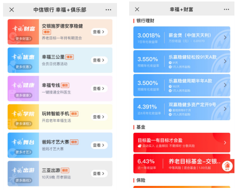 中信銀行“幸福+”是國(guó)內(nèi)著名的老年金融服務(wù)品牌,包括老有所養(yǎng)“幸福+財(cái)富”、老有所醫(yī)“幸福+健康”、老有所享“幸福+優(yōu)惠”、 老有所學(xué)“幸福+學(xué)院”、老有所游“幸福+出游”、老有所樂(lè)“幸福+舞臺(tái)”六大服務(wù)板塊,打造了慢病管理、電話家庭醫(yī)生、幸福三公里、老年課程、幸福專線、“幸福家爸媽才藝活動(dòng)”等多項(xiàng)深受老年客戶喜愛(ài)的爆款服務(wù)和活動(dòng)。