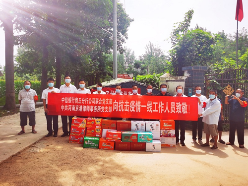 疫情防控期間,服務有溫度,更有社會責任和擔當。8月10日,中信銀行商丘分行公司聯合黨支部同中共河南京港律師事務所黨支部一道,赴睢陽區商都社區和梁園區孫福集鄉谷臺子村委會,慰問高溫酷暑下晝夜堅守崗位的疫情防控“戰士”,為他們送去了急需的礦泉水、方便面,傳達了中信銀行的慰問,向疫情防控的“最美逆行者”致敬。8月17日,中信銀行商丘分行機關黨支部得知許昌援商醫療隊在新城辦事處宇航社區開展核酸檢測工作,及時為他們送去了口罩、純凈水等抗疫物品,并派出黨員志愿者服務隊協助社區做好轄區疫情防控值班工作,緩解社區抗疫人員不足的壓力,將助力抗疫工作落到實處。