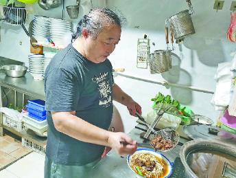 王長安是土生土長的焦作人,靠著手搟牛肉面,在焦作經營了30多年。每天一大早,夫妻倆就開始忙活起來,王長安和面、揉面,妻子則清理店鋪的每一個角落。10時許,熬制了幾個小時的鹵汁差不多完成了,開始散發出特有的鮮香味。