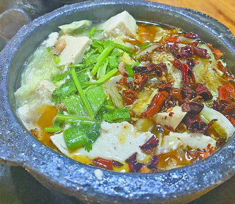 武陟砂鍋,傳承千年。制作時,先將肉類食材熱鍋清水?dāng)嗌⑷ギ愇叮缓蠓湃胧⒂星逅纳板亙?nèi),旺火燒開,再用小火慢慢煨煮,湯味濃厚,肉質(zhì)酥嫩香爛。最令人驚艷的是,武陟砂鍋端上餐桌后,服務(wù)員會端著一勺剛炸好的紅辣椒油倒入砂鍋,“刺啦”一聲,刺激食客們的味蕾。