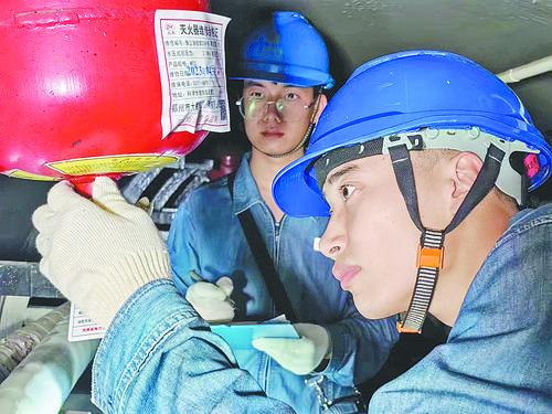 崔樂樂(右)在電纜隧道內(nèi)檢查滅火設(shè)備。本報(bào)記者 吉亞南 攝