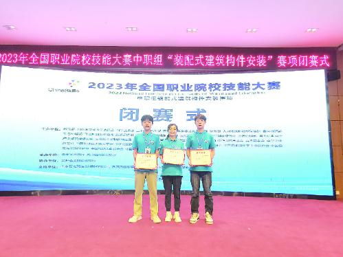 好事成雙。該校老師祁振悅與學生趙書玉、王志山獲得全國職業院校技能大賽中職“裝配式建筑構建安裝”師生同賽賽項二等獎。比賽除了理論知識考察外,側重預制構件吊裝、預制構建灌漿兩個技能操作,主要考察選手施工現場定位放線、裝配式建筑構建吊裝等知識,對團隊合作能力、質量意識、安全意識、職業素養均有較高要求。