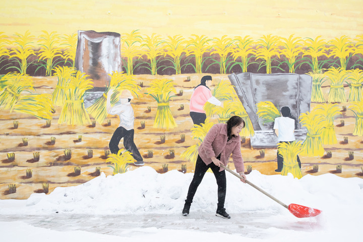 黑龍江省漠河市北極鎮北紅村“遠方故里”民宿負責人張翠花在清理積雪(2023年1月12日攝)。新華社記者 張濤 攝